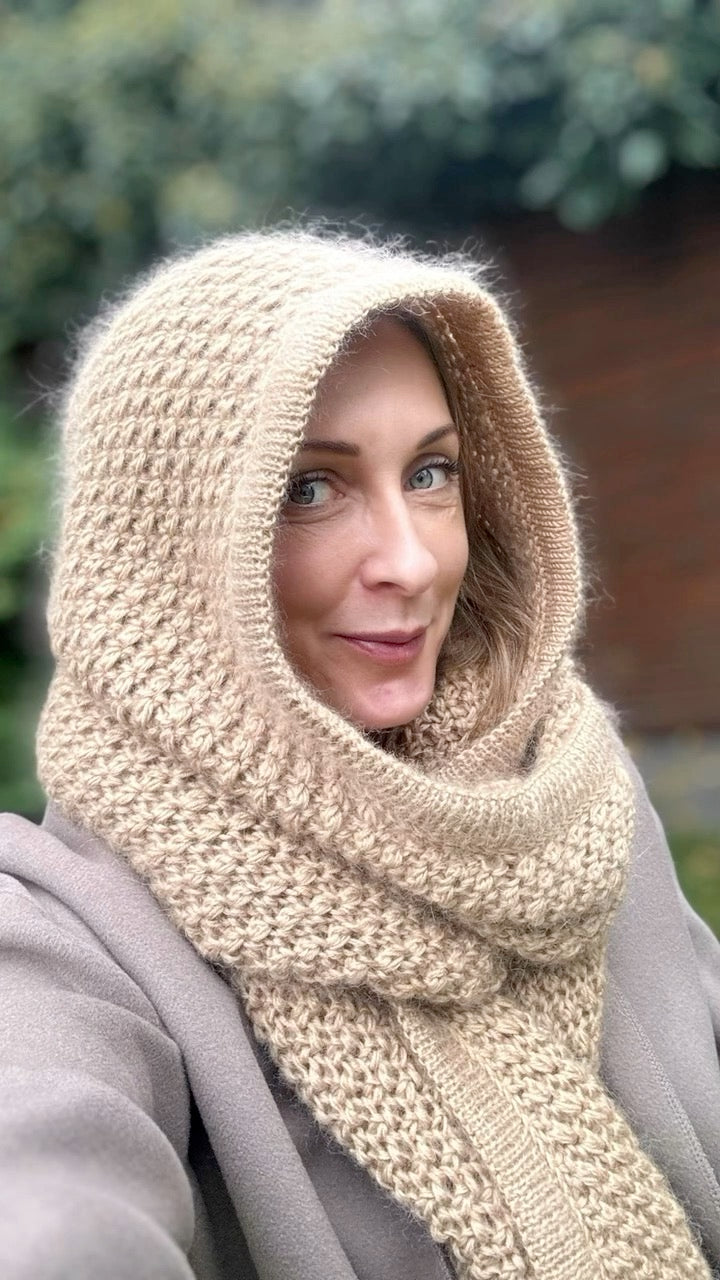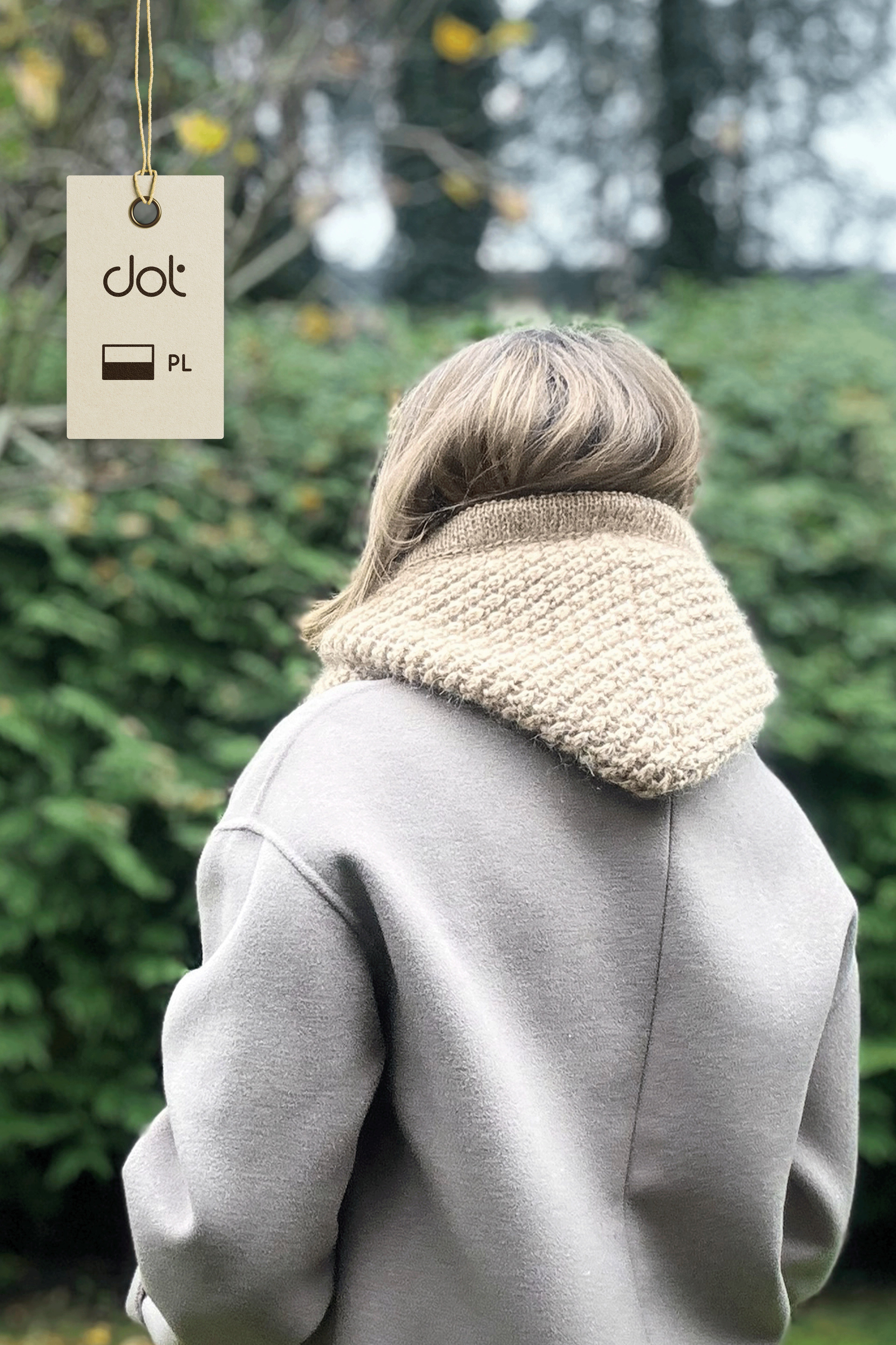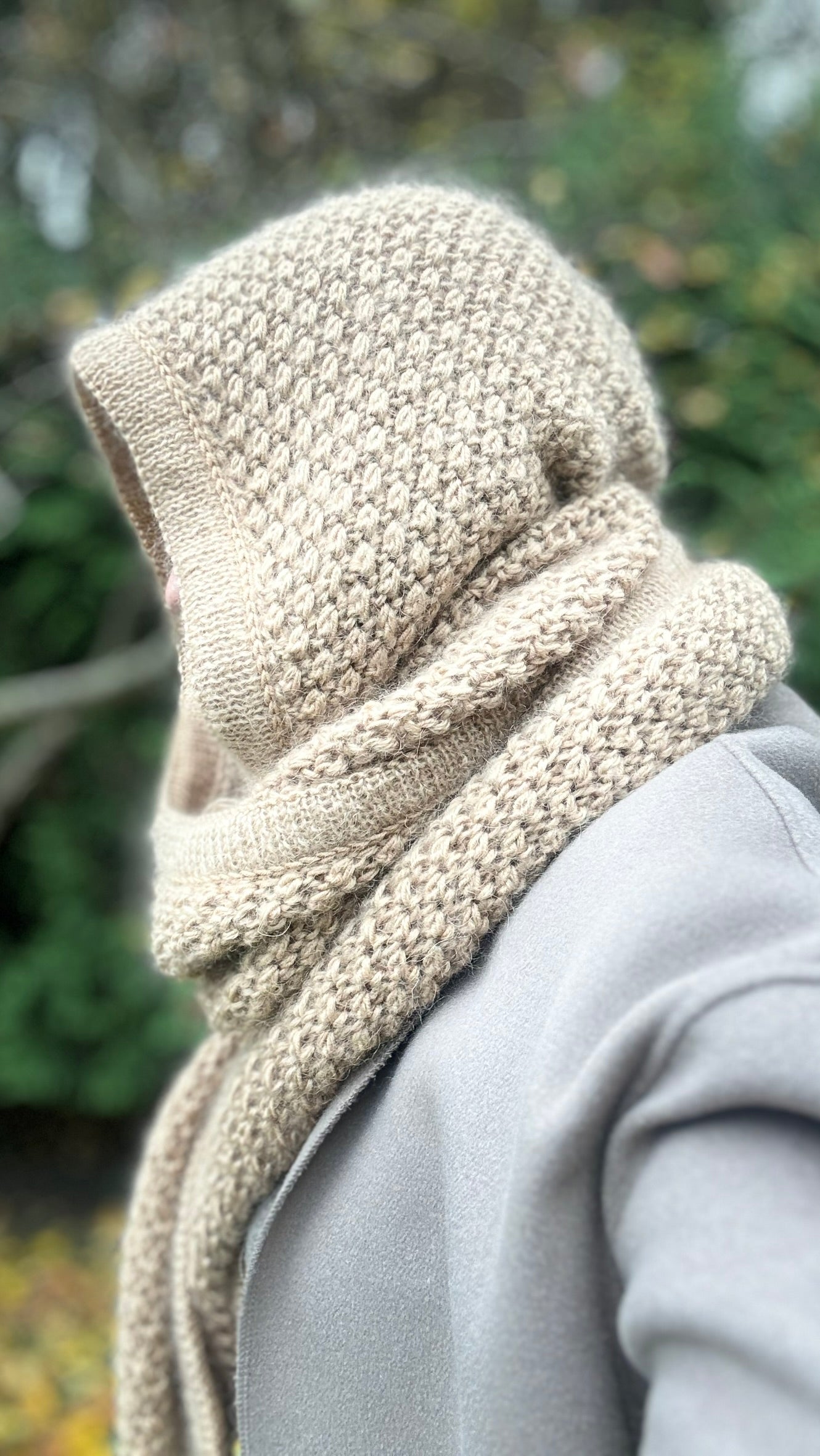 Pracę zaczynamy od dwustronnej plisy brzegowej, pojedynczą włóczką na cieńszych drutach. Następnie przechodzimy na wzór właściwy i przerabiamy szalik w rzędach, podwójną włóczką merino + moher. Gdy osiągniemy odpowiednią szerokość szalika wykonujemy kaptur na środku. Na końcu przerabiamy drugą plisę krawędziową na szaliku i wokół kaptura. Na koniec łączymy szydełkiem dwustronne plisy złożone na pół.