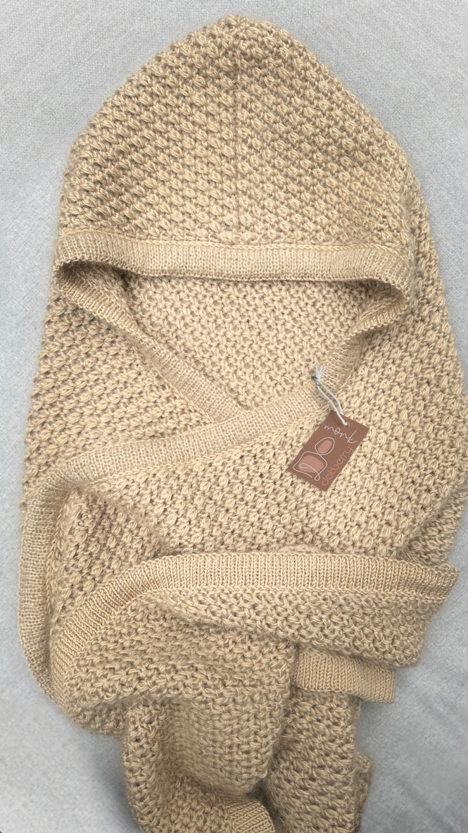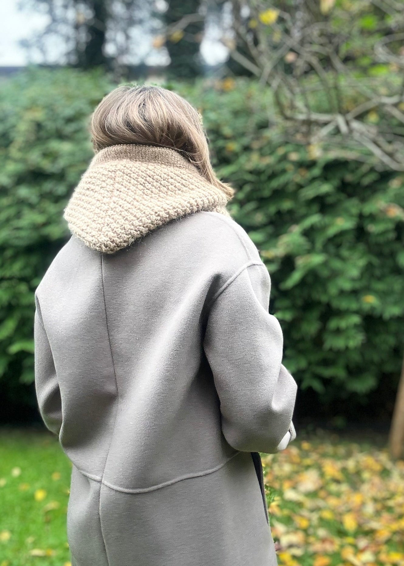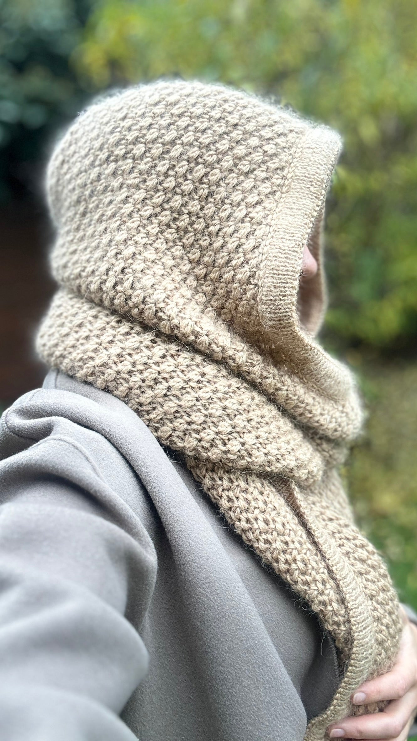 Pracę zaczynamy od dwustronnej plisy brzegowej, pojedynczą włóczką na cieńszych drutach. Następnie przechodzimy na wzór właściwy i przerabiamy szalik w rzędach, podwójną włóczką merino + moher. Gdy osiągniemy odpowiednią szerokość szalika wykonujemy kaptur na środku. Na końcu przerabiamy drugą plisę krawędziową na szaliku i wokół kaptura. Na koniec łączymy szydełkiem dwustronne plisy złożone na pół.
