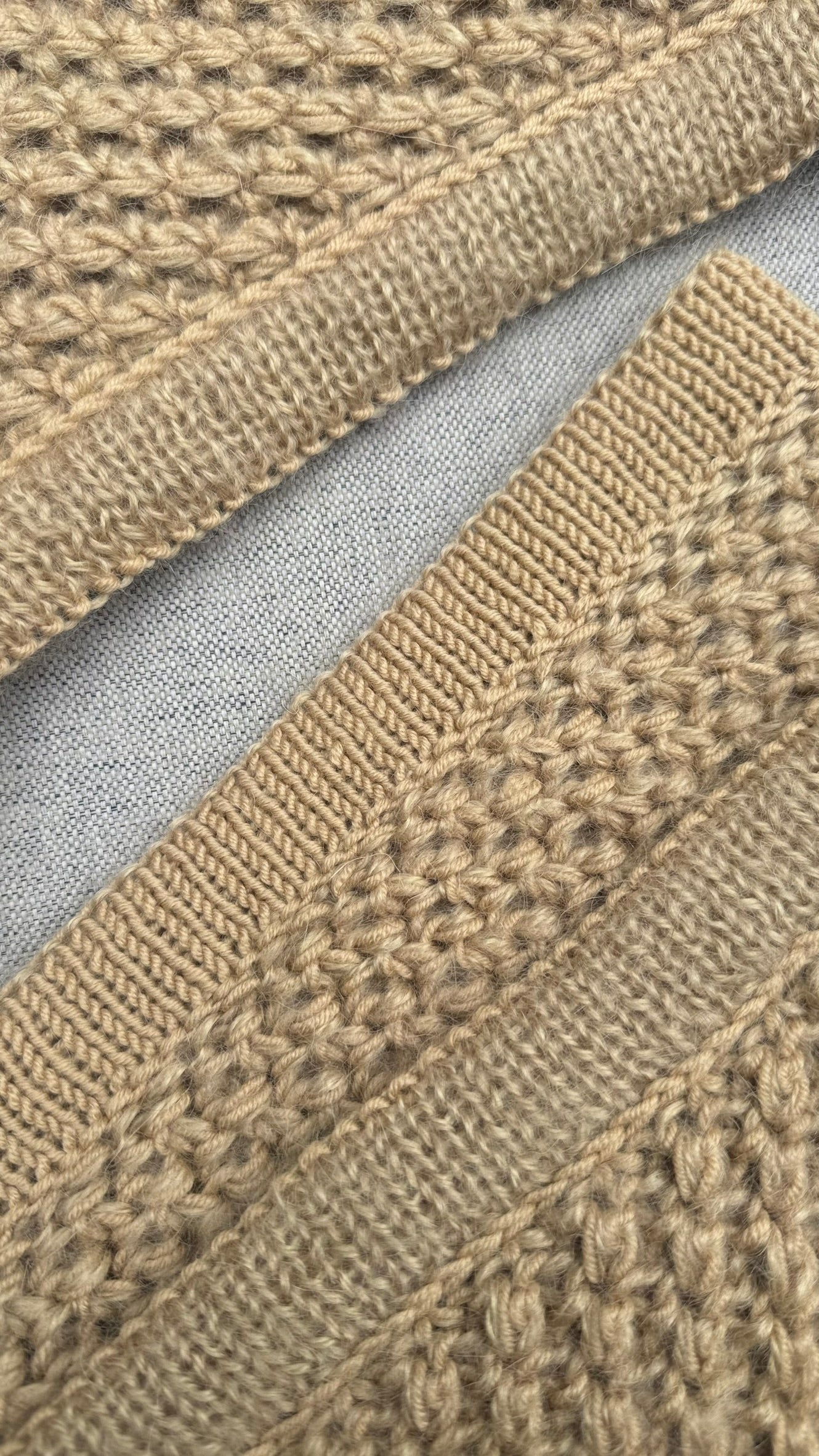 PRÓBKA: 10 cm x 10 cm / 12 oczek x 16 rzędów (podwójna nitka merino + moher, przerabiana wzorem strukturalnym, po zblokowaniu), druty nr 8
